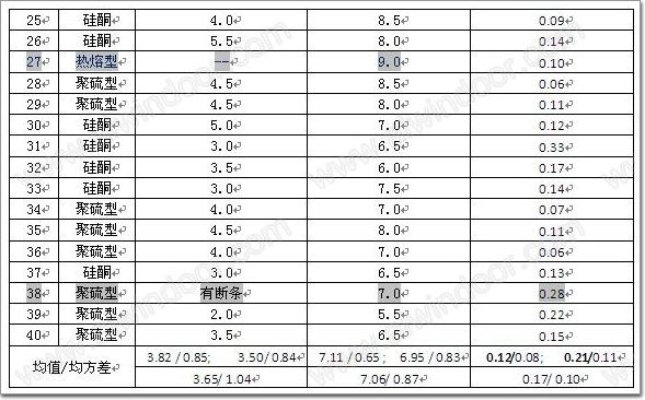 驗證試驗選取國內各類型企業共40組試樣,其中兩道密封的外層密封膠為聚硫型的20組,硅酮型19組。僅有一組采用