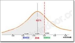 丁基膠厚度難以測量,密封膠牌號不詳,制作工藝水平也不盡相同,這些因素對試驗結果也會有影響。為評估樣品的加速耐久性能,本項分析剔除三組(22#、27#、38#)缺陷樣品,以I值為隨機變量,按正態分布統計其余37組樣品的水透率指數,結果表明總體均值為0.1679,方差0.1044,極大值0.55,按信度0.05水平(置信度95%)檢驗,總體I值≤0.20 的概率為62%(圖2陰影部分面積)。