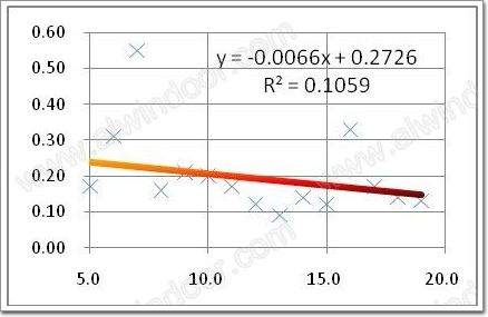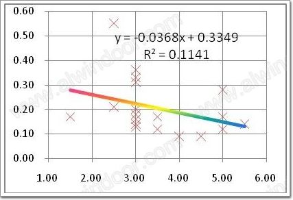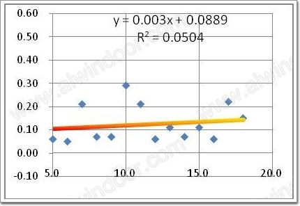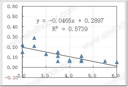37組樣品的外層分別采用聚硫和硅酮型密封膠,其中硅酮型樣品19組,I值的平均值為0.2063,方差0.1116,極大值0.55, 信度0.05水平檢驗I值≤0.20 的概率為48%(圖3);聚硫型樣品18組,I值平均值為0.1165,方差0.0789,極大值0.29, 信度0.05水平評估I值≤0.20 的概率為86%(圖4)。對比圖3-圖4,可見兩型樣品水分滲透指數差異顯著,置信度95%水平評估I值相差近一倍。