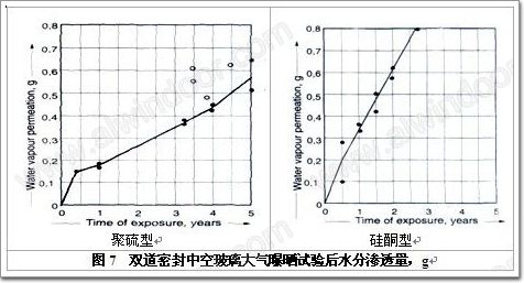 滲水0.80g,水滲透量相差一倍 。結果表明,若聚硫型外道密封中空玻璃有25年使用壽命,則硅酮型產品的使用壽命僅有10年,差異與驗證試驗的結果一致。