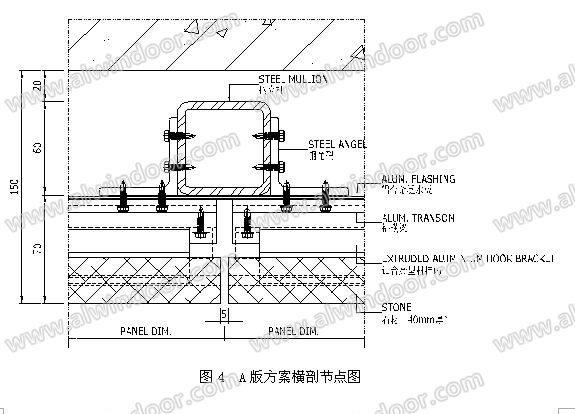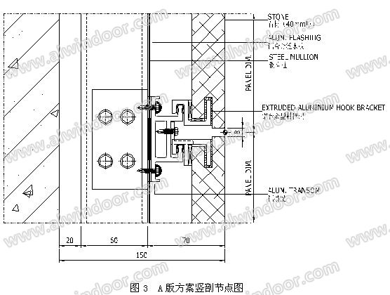 本項(xiàng)目石材幕墻原設(shè)計(jì)方案由設(shè)計(jì)院和幕墻顧問(wèn)公司完成,參見圖3、圖4: