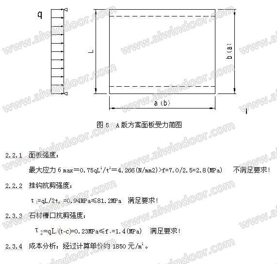 2.2 A版方案計(jì)算結(jié)果分析A版方案采用通槽連接,計(jì)算結(jié)果分析如下:(面板彎曲(詞條“彎曲”由行業(yè)大百科提供)強(qiáng)度標(biāo)準(zhǔn)值按石材廠家提供的7.0MPa考慮,材料分項(xiàng)系數(shù)取2.5,面板按40mm厚計(jì)算)
