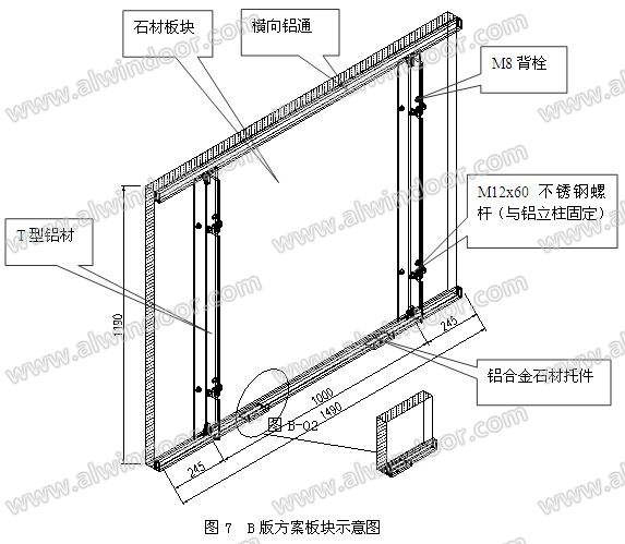 3.1.2 石材背面采用整體組合的加強(qiáng)附框,通過(guò)背栓與面板連接,并用環(huán)氧樹脂粘接(詞條“粘接”由行業(yè)大百科提供),附框下部設(shè)置托件支撐面板使背栓不受剪力。
