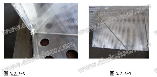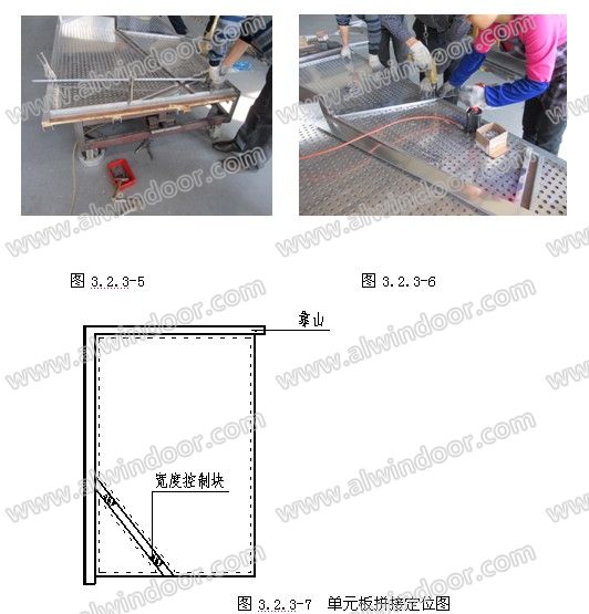 4 拼接:拼接應(yīng)在平整的作業(yè)臺上進行,作業(yè)平臺上設(shè)置互相垂直的靠山,拼接時,將所需的若干個分散的拼圖板塊按照單元板加工圖安置在作業(yè)平臺上,其中將互相垂直的兩條邊與靠山緊貼并夾緊,各拼圖板塊之間設(shè)置寬度控制塊,最后加裝拼接板,形成一個牢固的完整單元鋁單板。見圖3.2.3-5, 3.2.3-6,3.2.3-7 焊接打磨:對線條交接部位和折彎收角部位進行氬弧焊接,并進行修整打磨。見圖3.2.3-8掛耳安裝:在設(shè)計規(guī)定位置(相鄰單元板掛耳安裝孔應(yīng)錯位設(shè)置),將掛耳與單元鋁單板折邊處通過鉆孔、抽芯鉚釘連接牢固,保證掛耳的數(shù)量和質(zhì)量。見圖5.2.3-9