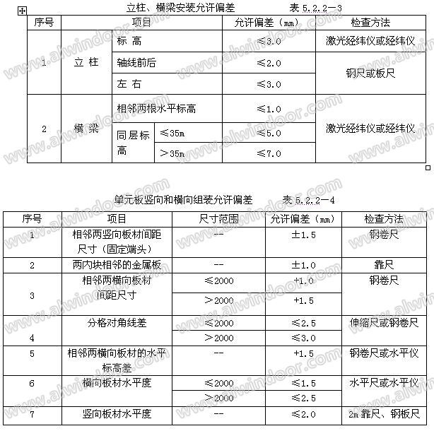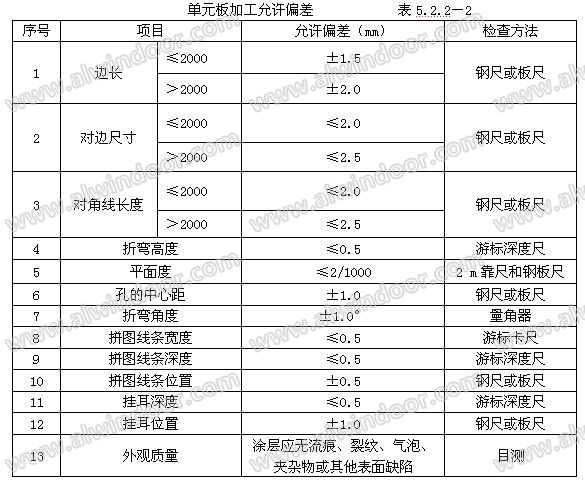 5 質量控制 5.1 執(zhí)行標準 1 《建筑工程施工質量驗收統一標準》 GB 50300-2001 2 《建筑裝飾裝修工程質量驗收規(guī)范》 GB 50210-2001 3 《金屬與石材幕墻工程技術規(guī)范》 JGJ 133—2001 5.2 質量檢驗 5.2.1 鋁單板幕墻依照《建筑裝飾裝修工程質量驗收規(guī)范》GB 50210-2001進行驗收。 5.2.2 鋁單板幕墻的質量要求、允許偏差和檢驗方法見表5.2.2-1、5.2.2-2、5.2.2-3、5.2.2-4、5.2.2-5。