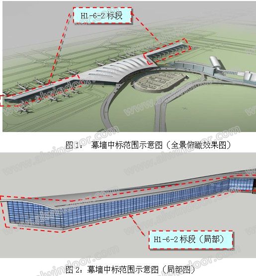 本文重點(diǎn)介紹為我司中標(biāo)范圍的H1-6-2標(biāo)段 T2航站樓指廊幕墻工程(詳圖1、圖2),幕墻總面積約40000㎡。