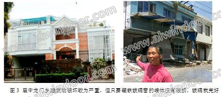蘆山縣的龍門鄉(xiāng)雖然是震中,烈度達(dá)到9度,破壞較為嚴(yán)重,但還是有許多保存完好的建筑。即使是受破壞的建筑,只要直接鑲嵌玻璃窗的墻體沒有損害,相應(yīng)其窗也完好 ( 圖3 ) 。