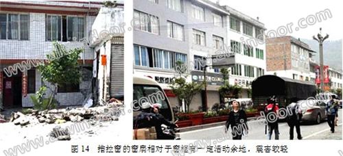 推拉窗扇是可以水平滑動的,即使在建筑變形很大時,它相對于窗框可以有一定程度的相對位移,實際變形要小于窗框,因而破損程度要小一些(圖14)。