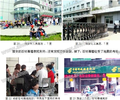 蘆山地震中鋁板幕墻沒有震害,雅安 (7度) 的一些工程,鋁板幕墻保持原狀,情況良好(圖20、圖21)。