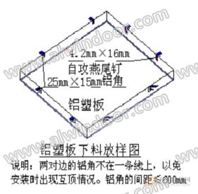 鋁塑板安裝,將鋁塑板陰角槽交接處的四個拐角用剪子剪掉,把加工好的鋁塑板沿陰角槽將2cm邊折起,四邊折起的鋁塑板安裝鋁角∠15mm×25mm,鋁角的一邊用自攻燕尾釘安裝到折起2cm的鋁塑板上,間距不大于600mm,待鋁角安裝完,鋁塑板就可以安裝到龍骨上。具體做法詳見下圖: