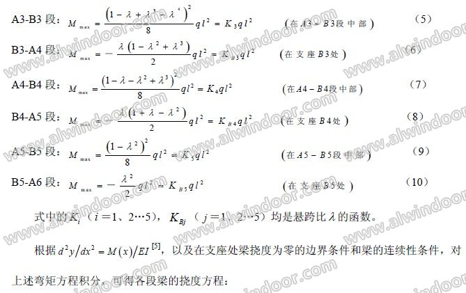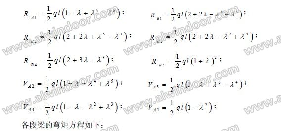 通常,一項建筑幕墻工程中的大部分幕墻立柱可按受均布荷載作用的等跨等截面鉸接梁計算。本文推導(dǎo)了按受均布荷載作用、五等跨等截面鉸接梁處理的建筑幕墻立柱(以下簡稱為幕墻立柱)的內(nèi)力和撓度方程及其最大值計算式,并據(jù)此編制了內(nèi)力和撓度計算系數(shù)表,可方便地用于幕墻立柱的結(jié)構(gòu)計算。