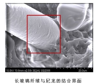 具有耐水解劑和界面結合劑的特殊短切玻璃纖維與尼龍有效的結合在一起,在拉伸斷裂后尼龍牢固地粘合在玻璃纖維表面。