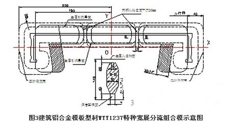 根據(jù)該扁寬薄壁型材的寬厚比值高達(dá),屬于高難度擠壓型材,對(duì)其模具設(shè)計(jì)方案需要經(jīng)過(guò)反復(fù)計(jì)算和對(duì)比分析,才能確定最佳方案。最終選擇分流寬展模與型材模相組合的特殊模具結(jié)構(gòu)。