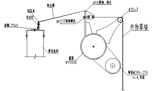 幕材與幕材間連接處用夾板夾緊,用螺栓固定;幕材與拉索間采用不銹鋼掛鉤連接,掛鉤間距0.5m(見圖5.2.7)。