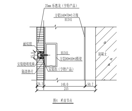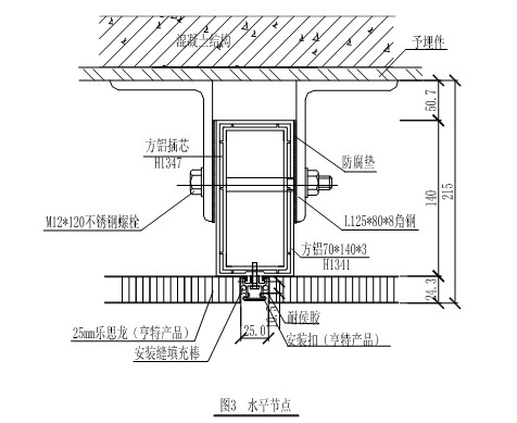 (二)、在預(yù)埋件上焊接夾接件,立柱通過(guò)夾接件(L125×80×8)與墻體固定,立柱與夾接件間墊PVC墊片,防止電化學(xué)腐蝕(見(jiàn)圖3)。