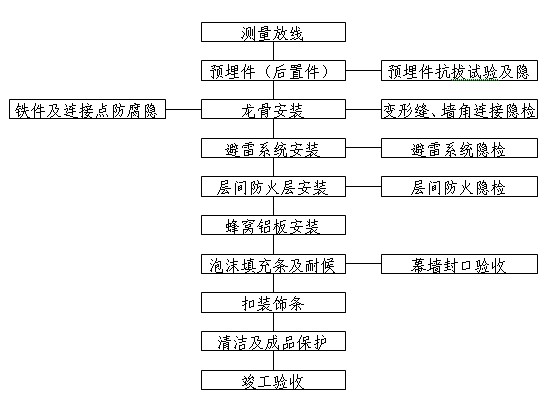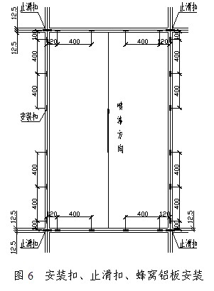 撕下背板保護膜將隔離墊片貼在龍骨上,將蜂窩鋁板貼向龍骨,其自重由水平止滑扣承擔;在對應的螺釘孔上裝上安裝扣和螺釘(此時安裝扣是非緊固狀態),調整板的位置緊固上邊的安裝扣;繼續按以上方法安裝下面另一塊板,確保所有的板在同一平面上。