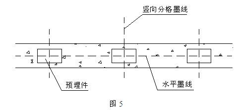 2、幕墻分格軸線的測量放線應與主體結構放線相配合,立柱與結構連接點水平中軸線的放測應以±0.000水準點為基點用高精度水準儀和鋼尺把每層樓幕墻水平中軸線引測到預埋鐵件上,從而在每個預埋件或附近形成十字交叉基準線,見圖5,并以此檢查預埋件實際偏差值。