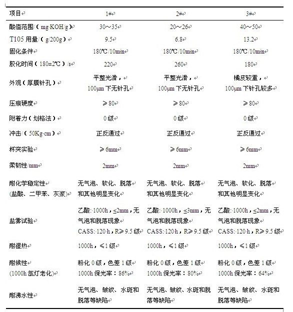 試驗選取國產樹脂2廠不同酸值類型(30~35、20~26、40~50,mgKOH/Kg)的聚酯樹脂,以寧波南海T105固化劑,選用通用型流平劑、脫氣劑、安息香及鈦白粉、硫酸鋇等,按照鋁型材用粉末涂料進行配方設計,結果如表3所示。