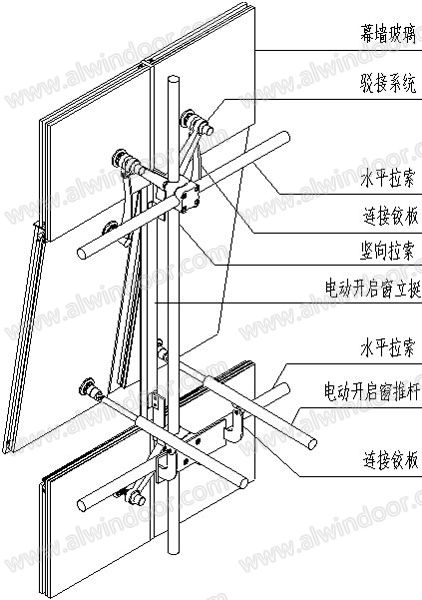 開啟窗上邊與點玻駁接爪連接采用專用的不銹鋼抓點轉軸五金配件,并且將此轉軸件置于室內側,以避免傳統(tǒng)的外置掛軸外露室外影響立面效果的情況發(fā)生。電動開啟裝置采用全封閉式內螺紋驅動結構,具有更好的封閉性,特別適于粉塵風沙等空氣顆粒污染較大的環(huán)境使用。