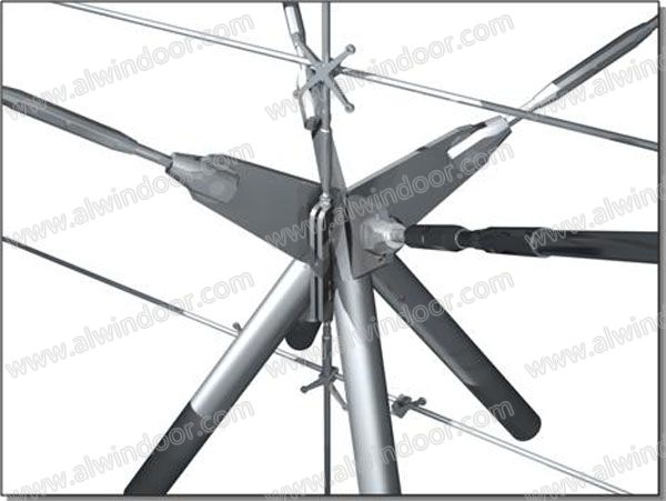 玻璃百葉通過不銹鋼夾板與鋁合金框連接,玻璃百葉整體單元安裝完畢后,與單索幕墻不銹鋼點爪通過4個M12的不銹鋼裝飾螺栓固定。