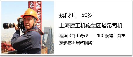 在宏偉的建筑背后,是工人們?nèi)諒?fù)一日的辛勞與付出。在上海中心大廈完成結(jié)構(gòu)封頂之前,中央電視臺(tái)走基層欄目記者跟蹤拍攝了一位普通工人魏根生。59歲的老魏是上海建工機(jī)施集團(tuán)年紀(jì)最大的塔吊司機(jī),熱愛攝影的他通過一組《海上奇觀——虹》的照片獲得了上海市攝影藝術(shù)展覽銀獎(jiǎng)。這是個(gè)含金量極高的獎(jiǎng)項(xiàng),作品在網(wǎng)上瘋轉(zhuǎn),贊帖無數(shù),魏根生成了大家追捧的紅人。就是這樣一位普通的塔吊司機(jī),一位站在不一樣高度拍攝別人不可能拍攝到的美麗畫面的“高空攝影師”魏根生,經(jīng)上海建工王瓊總工的推薦,在組委會(huì)的盛情邀請下,攜多幅作品正式入圍“墅標(biāo)杯——人文•風(fēng)光•建筑”攝影大賽暨第四屆門窗幕墻行業(yè)攝影展,在這里預(yù)祝他能夠獲得好的成績。