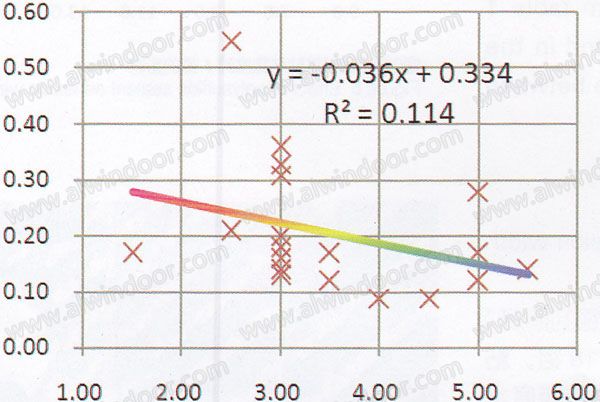 硅酮型樣品19組,丁基膠粘結寬度均值3.50 mm,萬差0.84mm;聚硫型樣品18組,丁基膠粘結寬度(密封厚度)均值為3.82 mm,方差0.85mm,可見粘結尺寸水平相當。分析樣品I值與丁基膠粘結厚度相關性,表明試驗條件下I值隨丁基膠粘結厚度的增加有下降趨勢,相關系數分別為0.1141和0.5739,為弱相關和中等相關(圖7、圖8)。