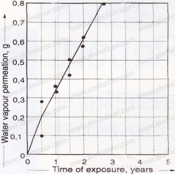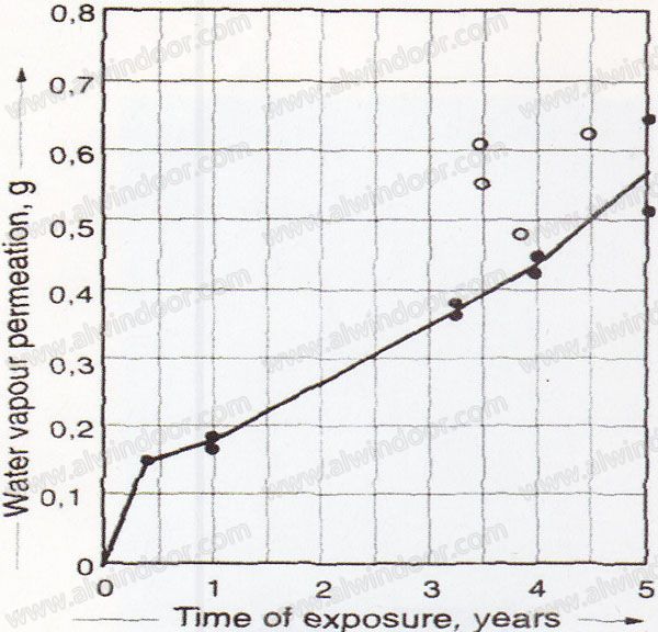 2.以干噪劑吸水質量變化為基礎的加速耐久性試驗,適用于中空玻漓耐久壽命評估和產品質量分級(DIN1286)。該試驗原理也可用于中空玻璃使用的不同密封膠的性能,為建筑設計選材提供技術依據。如將質量已知的干噪劑封裝在中空玻璃內,測定濕熱加速試驗后的透濕增量,相對評價不同粘接體的密封耐久性。Teroson公司采用類似的方法對雙道密封中空玻璃樣件進行大氣曝曬試驗,測定不同曝曬時間的滲水量,結果表明聚硫型樣件曝曬3年,滲水質量為0.35g,而同期硅酮型樣件滲水質量高達0.80g(圖9)。該試驗結果與上述驗證試驗一致。由此可以推測,若聚硫膠密封中空玻漓有25年的使用壽命,而硅酮型產品僅有10年,可有一倍以上的差異。
