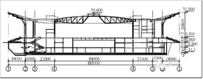 結構剖面圖及平面圖見圖2~4。會展中心結構體系采用鋼骨混凝土框架-鋼筋混凝土剪力墻(詞條“剪力墻”由行業大百科提供)體系,主要抗側力構件為沿圓形主會場周圈布置的核心筒及弧形剪力(詞條“剪力”由行業大百科提供)墻,墻厚300mm。