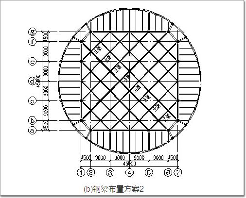 主會場使用功能包括舉行各種會議、展覽、演出等,工況復雜且荷載較重。針對鋼梁布置形式,進行了包括雙向主梁、雙向主次梁、斜向網格主次梁等多種方案比選,如圖8所示。根據用鋼量、施工便利性等指標比較,最終采用了方案1,即主次梁的布置方式,其中主梁采用H2000×800×32×50,H2000×500×36×50,次梁采用HN700×300×14×25。
