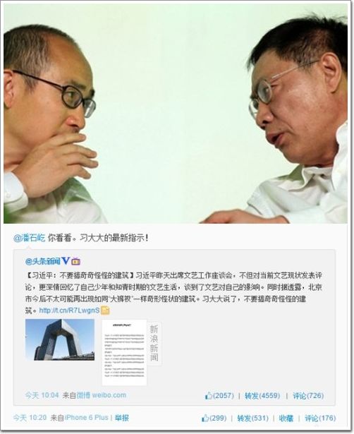 2014年10月15日,習近平總書記出席了文藝工作座談會。會上習大大說了,“不要搞奇奇怪怪的建筑”。報道稱,北京今后不太可能再出現如同“大褲衩”一樣奇形怪狀的建筑了。