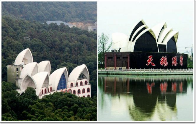 左圖為江蘇華西村,山寨版的悉尼歌劇院;右圖為江蘇阜寧縣城的白天鵝公園,山寨版的悉尼歌劇院。
