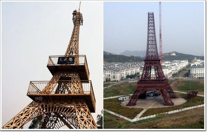 左圖為杭州某號稱“法國小鎮”的小區內聳立的山寨版埃菲爾鐵塔,該塔按照3:1的比例修建;右圖為福建福清,山寨版的埃菲爾鐵塔。