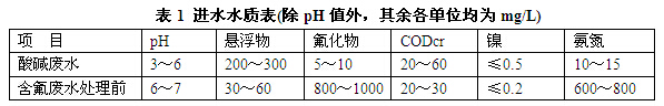 該鋁型材廠現有廢水處理站設計處理能力為:1500m3/d,其中含氟廢水50m3/d、酸堿廢水1450m3/d,含氟廢水從產污工序中單獨進行一級處理,處理后與酸堿廢水混合進入廢水中和池進行二級處理,設計廢水處理水質參數見表1所示: