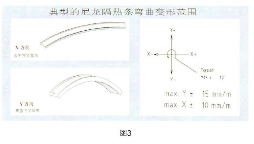 尼龍隔熱條尤其是異形,空心隔熱條有彎曲變形是不可避免的,但是,控制在一定范圍內,是可以滿足使用的,見圖3