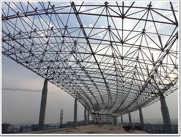重慶江北機場T3A航站樓建筑造型線條整體流暢,現代感強,以流暢的曲線為基調,從來自兩側指廊的曲面向中央匯集,寓意“兩江匯流”,亦像一只振翅欲飛的神鳥。 在整個屋面鋼結構體系中,通過雙曲面正交正放四角錐焊接球網架實現整體造型;通過鋼管混凝土柱提供屋蓋支撐。其中鋼管混凝土柱在混凝土結構的二、三層樓面標高(詞條“標高”由行業大百科提供)處設置V型高強度鋼支撐和埋設的大型鋼梁埋件通過可轉動關節軸承連接。精工鋼構依托其強大的焊接技術力量和豐富的厚板焊接經驗,完美的完成了V型支撐與埋梁連接部位的異種材質(Q420-B/Q345-B)超厚鋼板(130 mm)T型焊縫焊接,沿用在重慶江北國際機場T2B航站樓工程中采用的QA(品質保證)、QC(品質控制)質量管理體系,從材料采購、人員資質、設備校準、工藝準備、工藝執行等方面進行全過程質量控制。
