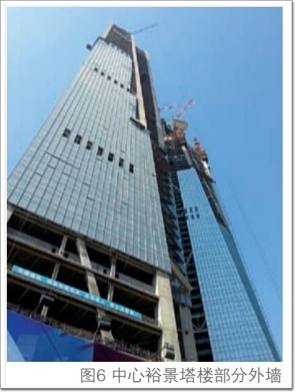 裕景項目塔樓部分采用的即為單元式玻璃幕墻。這些單元式幕墻在工廠內完成組裝,按照預定的安裝順序運抵施工現場完成幕墻安裝(圖 6,7)。