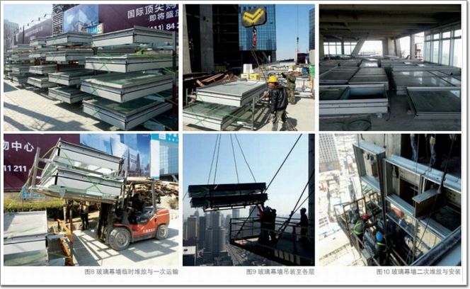 單元式玻璃幕墻從加工完成到現場安裝需要經過存放、運輸、存放、吊裝、安裝幾個環節。由于單元模塊具有面積大、厚度大、重量大、易損壞等特點,所以每一個環節都需要有專門的機械工具來輔助完成。幕墻單元的存放占用的場地大,所以要盡可能巧妙地安排幕墻單元塊的供應時間,既能滿足安裝要求,又不至于長時間占用施工場地(圖8~10)。因為運輸工具、吊裝工具多以標準單元的需求進行設計,所以標準單元的運輸環節要比非標準單元的運輸簡單,而對于非標準單元的運輸則要做特殊的運輸方案。