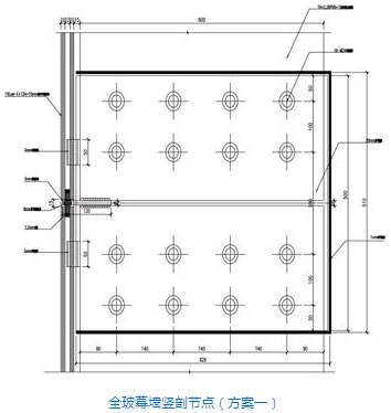14米高全玻幕墻分布在建筑北面的一層入口處,玻璃肋高度14.18米,寬度600mm;面板玻璃分格寬度2160mm,高度方向分為3塊,從下往上依次為4700mm、5300mm、4000mm。面板及玻璃肋均采用超白鋼化玻璃(詞條“鋼化玻璃”由行業大百科提供)。面板玻璃配置為:10low-e+12A+10鋼化中空玻璃。
