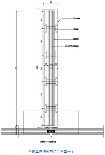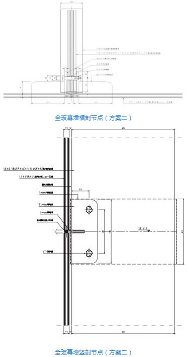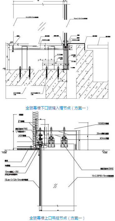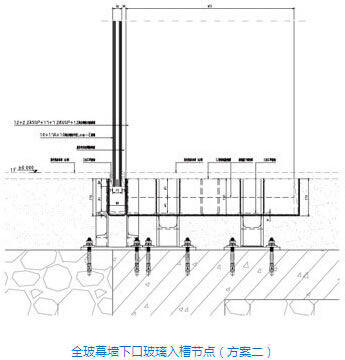 玻璃肋方案一采用三片相接的19+2.28PVB+19超白鋼化夾膠玻璃;三片玻璃肋從下往上依次為4700mm、5300mm、4000mm(不計入槽深度及吊掛的封修高度)玻璃肋接縫與面板玻璃接縫在同一高度同一位置,為幕墻顧問方案。