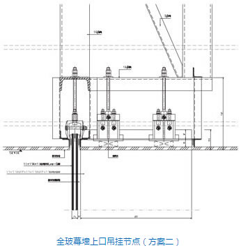 方案二采用單片12+2.28SGP+12+2.28SGP+12超白鋼化夾膠玻璃,單片玻璃高度達14.18米,為建議方案。玻璃肋采用吊掛形式,最上一塊面板玻璃采用吊掛形式。面板通過固定在玻璃肋上的不銹鋼板承托固定。