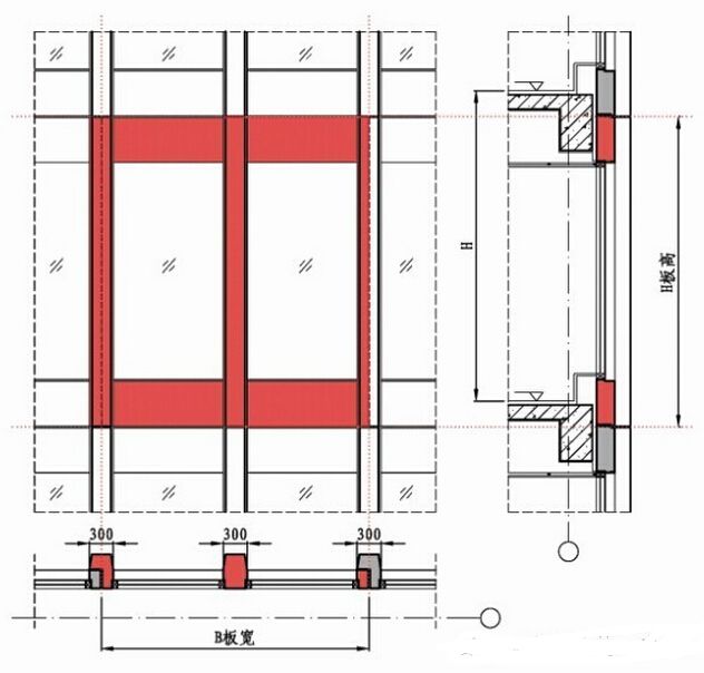建筑師確定的標(biāo)準(zhǔn)掛板尺寸為3 . 7m長(zhǎng)、1.6m高。深化設(shè)計(jì)時(shí)發(fā)現(xiàn)立面分格線(xiàn)與主體結(jié)構(gòu)的軸線(xiàn)、標(biāo)高沒(méi)有對(duì)應(yīng)關(guān)系,這就使預(yù)制外墻掛板與主體結(jié)構(gòu)的連接比較復(fù)雜,龍骨體系的布置與主體結(jié)構(gòu)發(fā)生沖突。由于掛板型號(hào)與節(jié)點(diǎn)類(lèi)型很多,給生產(chǎn)和安裝帶來(lái)諸多不便,造價(jià)較高。為此,我們做了分塊方案優(yōu)化。水平方向調(diào)整分格方案,讓板縫分割線(xiàn)和軸線(xiàn)建立定位關(guān)系,適當(dāng)調(diào)整掛板的寬度尺寸;標(biāo)高方向增設(shè)豎向龍骨,預(yù)制外墻掛板與鋼龍骨或混凝土結(jié)構(gòu)梁連接。調(diào)整后的立面細(xì)部如圖9所示,較好地滿(mǎn)足了建筑設(shè)計(jì)要求。