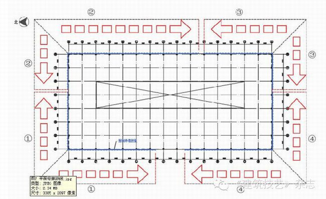 由于該項(xiàng)目建筑平面尺寸較大墻板的水平向和豎向均采用企口接縫。外掛板的安裝順序非常關(guān)鍵,設(shè)計(jì)階段應(yīng)考慮掛板安裝順序,豎向要求從低到高逐層安裝,水平向應(yīng)從四個(gè)角點(diǎn)向中間安裝,經(jīng)過(guò)反復(fù)研究和優(yōu)化,制訂平面安裝動(dòng)線(xiàn)(圖7)。