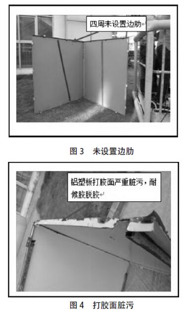受某中級人民法院委托,對A 工程進行施工質量鑒定。A 工程位于福建南部地區,共有三棟大樓,均為五層建筑物。外裝飾含玻璃幕墻、鋁塑板幕墻、鋁合金窗分項。上述外裝飾工程于2008 年完工,但未經相關部門驗收。經檢查發現,部分耐候膠硬化、開裂,如圖1;鋁塑板面板嚴重褪色、發白,如圖2;部分鋁塑板面板四角處未設置角連件,未設置邊肋,僅設置1 根中肋,且嚴重銹蝕,如圖3;部分鋁塑板打膠面嚴重臟污,造成耐候膠脫膠,如圖4;橫梁與主體結構之間采用角碼連接,部分橫梁與角碼嚴重腐蝕,如圖5;部分轉角處未設置立柱,圖中橫梁僅剩下一半截面,且嚴重腐蝕,如圖6。該工程存在嚴重安全隱患。