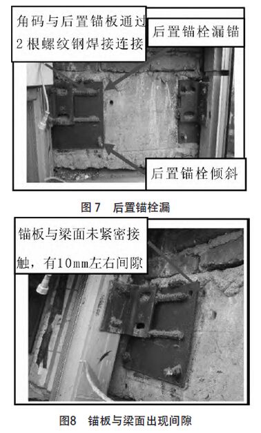 B 工程位于福建北部地區,大廈外裝飾為隱框玻璃幕墻和鋁單板幕墻,于2004 年竣工,至今已使用近10 年。檢查發現,有一處隱框玻璃幕墻處的后置錨固件(詞條“錨固件”由行業大百科提供)中有1 根錨栓漏錨、1 根錨栓傾斜、錨板與梁面未緊密接觸,有10mm左右間隙;此外,角碼與錨板的連接采用螺紋鋼過渡焊接,焊縫長度及位置不符合設計要求,如圖7、8,存在嚴重安全隱患。部分開啟扇執手(詞條“執手”由行業大百科提供)斷裂、開啟扇密封膠條已老化(詞條“老化”由行業大百科提供),如圖9、10,存在安全隱患。檢查發現鋁單板幕墻處,部分面板之間的接縫密封膠漏打,如圖11,導致幕墻漏水,造成錨板銹蝕。