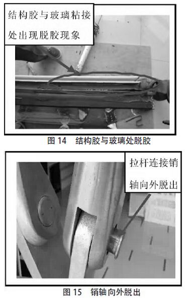 C 工程位于福建南部地區,外裝飾結構形式采用橫明豎隱玻璃幕墻、氟碳噴涂鋁單板金屬幕墻以及點支撐玻璃幕墻(詞條“點支撐玻璃幕墻”由行業大百科提供),幕墻總高度為100.9m,幕墻裝修面積約為13000m2,其中半隱框玻璃幕墻約為6050m2,點支撐玻璃幕墻約為145m2,鋁單板幕墻約為6805m2,根據業主委托,只對玻璃幕墻進行安全性鑒定。檢查發現,用于玻璃與鋁附框(詞條“附框”由行業大百科提供)粘接的結構膠已老化,結構膠最大拉伸強度時伸長率為71%;邵氏硬度為71;21 層抽樣處,立柱與主體結構連接只設置了右側角碼,左側未設置角碼,見圖12;4 層會議室處,用于玻璃與鋁附框粘接的結構膠沿鋁附框長邊方向出現150mm左右的脫膠,見圖13;10 層抽樣檢查位置處,用于玻璃與鋁附框粘接的結構膠沿玻璃長邊方向出現300mm左右的脫膠,如圖14,且結構膠已老化,結構膠最大拉伸強度時伸長率為51%,邵氏硬度(詞條“硬度”由行業大百科提供)為69;點支撐玻璃幕墻多處拉桿松動,有1 處拉桿連接銷軸向外脫出,如圖15,存在安全隱患。另外,除點支撐玻璃幕墻外的其它鑒定單元的玻璃面板(詞條“玻璃面板”由行業大百科提供)均采用外側為鋼化玻璃、內側為普通浮法玻璃的中空玻璃,不符合發改運行[2003]2116號文《建筑安全玻璃管理規定》中第六條必須使用安全玻璃的規定。