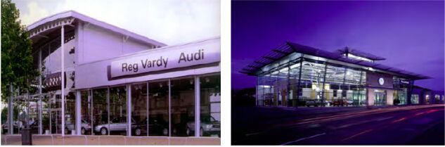 汽車展廳使用幕墻作為外墻圍護結構是再合適不過的了。不管是玻璃幕墻還是彩鋼幕墻,或者是其二者的組合都會營造出一種精致輕盈、賞心悅目的效果。