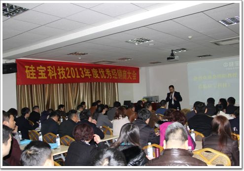 2014年2月18日至20日,硅寶科技2013年度優(yōu)秀經(jīng)銷商大會于硅寶科技總部隆重召開,硅寶科技總經(jīng)理王有治帶領公司高管、各部門經(jīng)理及眾銷售人員出席本次會議。本屆會議的主題為“新夢想·新挑戰(zhàn)·新跨越”,來自全國各地的數(shù)十家優(yōu)秀經(jīng)銷商前來參會,共襄盛舉,共謀發(fā)展,暢想未來。