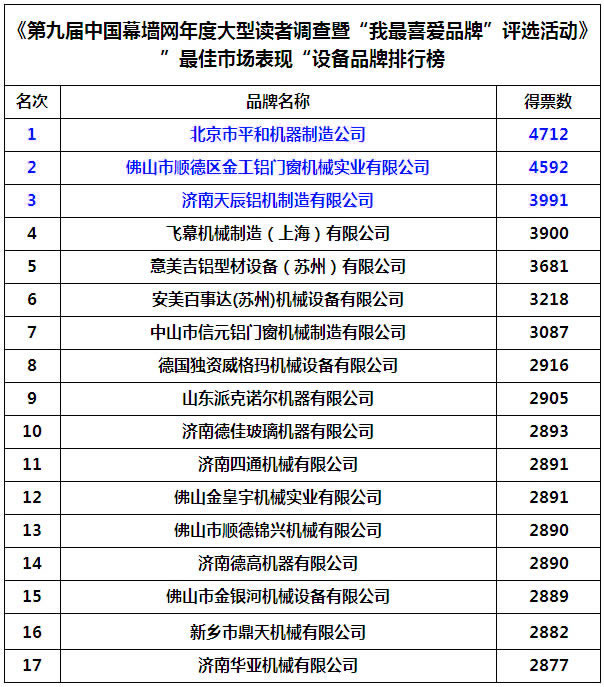 本屆活動,于2013年11月正式啟動,在2014年的3月1日結束,歷時三個月,通過對入圍的門窗型材、建筑玻璃、結構膠、加工設備、五金配件、隔熱材料六大類企業,132個品牌以網上實名投票的方式,采集到的56,105張有效選票,進行排名分析與整理,分別從品牌的用戶認同度和產品的市場占有率方面,評選出 “用戶首選品牌”和“最佳市場表現”,兩大獎項,現將“加工設備”類型企業的排名情況公布如下。