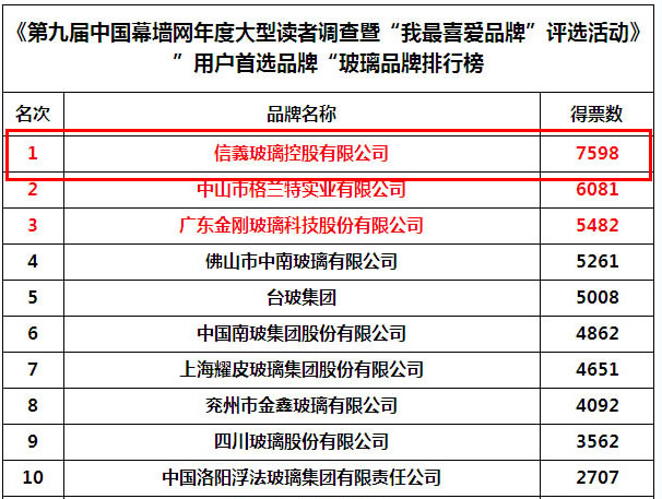 信義玻璃控股有限公司榮獲第九屆中國幕墻網大型讀者調查活動用戶首選品牌第一名