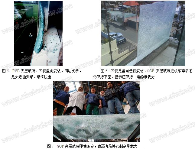 SGP 間膜夾層玻璃整體性好,SGP夾膠膜的撕裂強度是PVB夾膠膜的5倍,即使玻璃萬一破碎,SGP膜還可以粘結碎玻璃形成破壞后的一個臨時結構,其彎曲變形小,還可以承受一定量的荷載而不會整片下墜。這就大大提高了玻璃的安全性(圖6、圖7)。